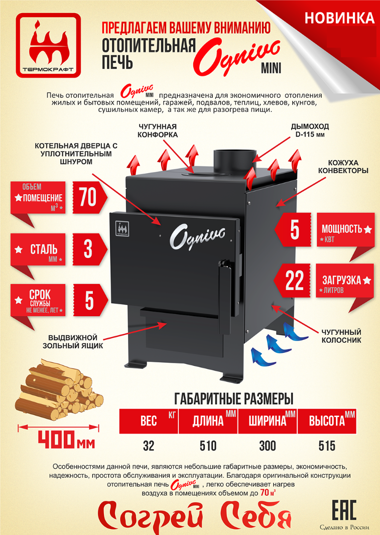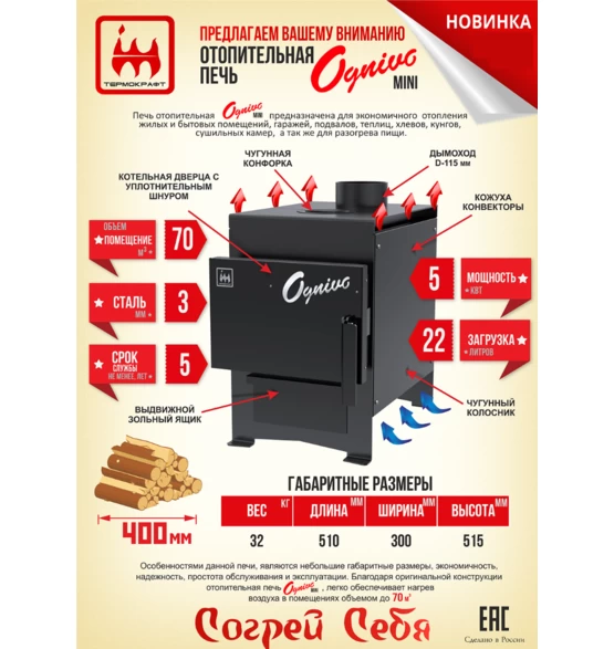 Основное предназначение печи Ognivo mini(Огниво мини) – отдача воздушного тепла в жилых и нежилых помещениях временного проживания людей, а также для разогрева и приготовления пищи.