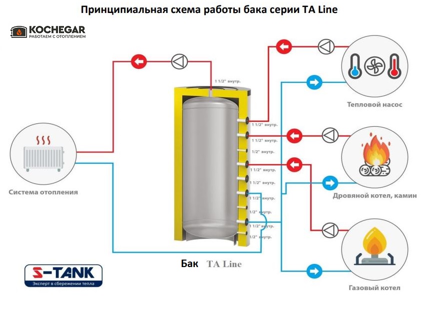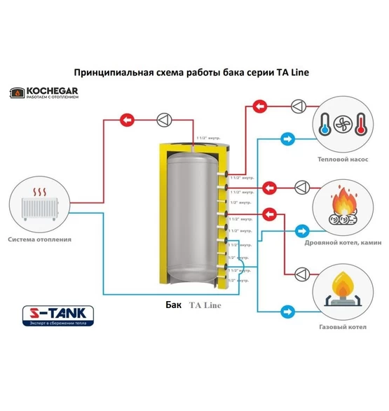 Бак S-Tank TA line 500 предназначен для аккумулирования тепла от различных источников и построения многовалентных систем отопления (т.е. если Вам необходима совместная работа нескольких источников тепла, например, Вы хотите объединить работу твердотопливного котла и электрического котла, или газового котла и дровяного котла, или теплового насоса и твердотопливного котла и электрического котла, и так далее). Бак S-TANK серии TA line улучшает гибкость системы отопления, является гидравлическим разделителем контуров системы. Хорошо сочетает следующие источники тепла: Твердотопливный котел, пеллетный котел, котел на биомассе, камин с водяной рубашкой, тепловой насос, газовый котел, электрический котел.