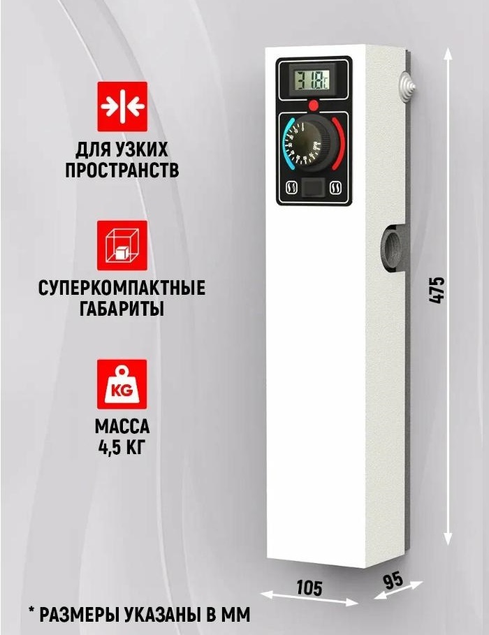 Корпус выполнен в классическом белом цвете и рассчитан на настенный монтаж. Простая конструкция без сложной электроники повышает надёжность оборудования и облегчает эксплуатацию.
