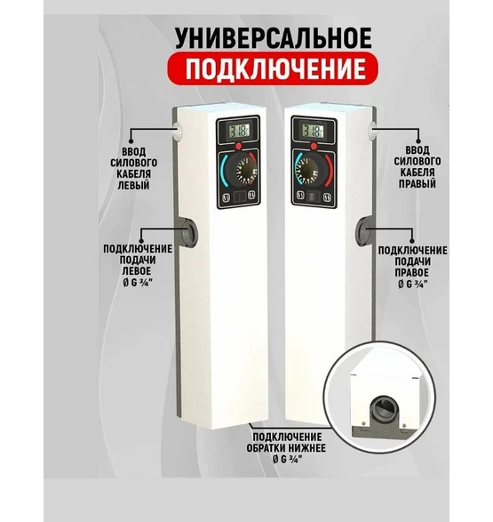 Котёл работает от стандартной сети 220 В и не требует подключения газа, дымохода или получения дополнительных разрешений. Нагрев теплоносителя осуществляется с помощью встроенных ТЭНов, обеспечивающих стабильную и равномерную передачу тепла.