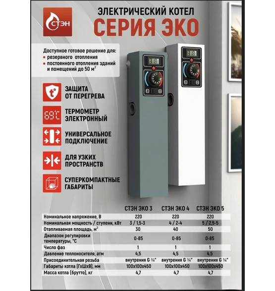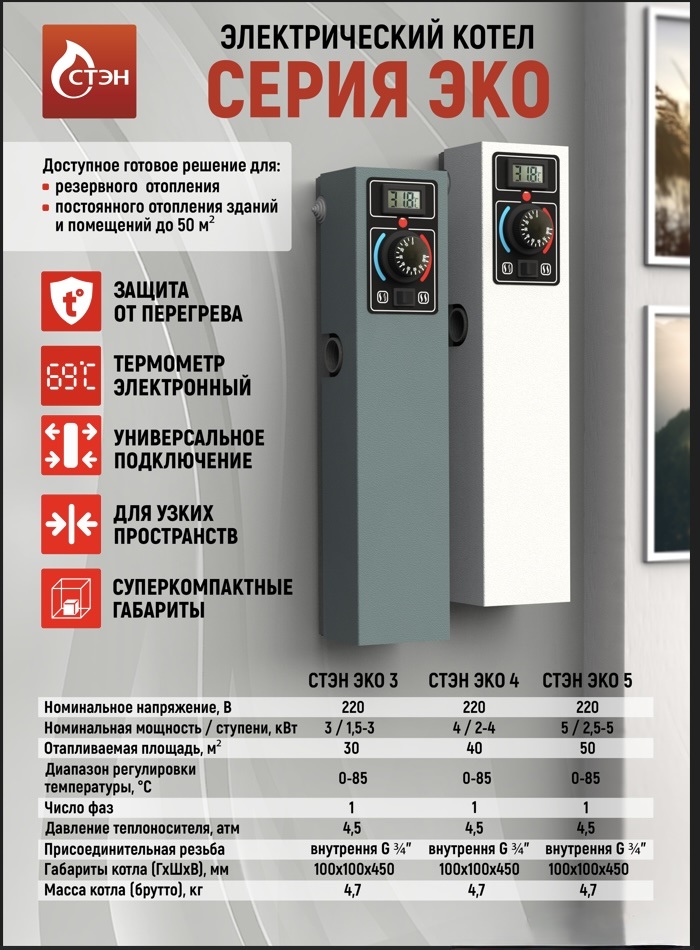 Электрический котёл СТЭН ЭКО 3 кВт предназначен для автономного отопления небольших помещений и работы в закрытых системах отопления. Модель подходит для квартир, дач, гаражей, мастерских и технических помещений, где требуется простое и надёжное электрическое отопление.