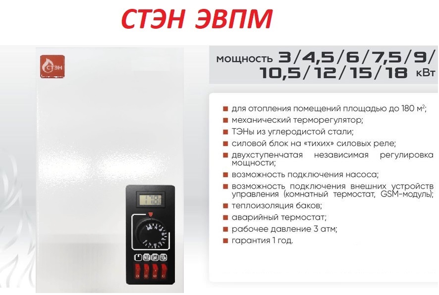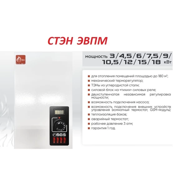 Электрокотел СТЭН (Sten) ЭВПМ 9 предназначены для отопления помещений площадью до 90 м². Котлы оснащены механическим терморегулятором . В изделиях установлены ТЭНБ с ТЭН-ами из углеродистой стали , применен силовой блок на «тихих» силовых реле и двухступенчатая независимая регулировка мощности, предусмотрена возможность подключения насоса. Рабочее давление 3 атм. Баки котлов теплоизолированы.