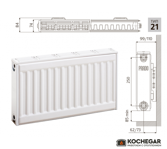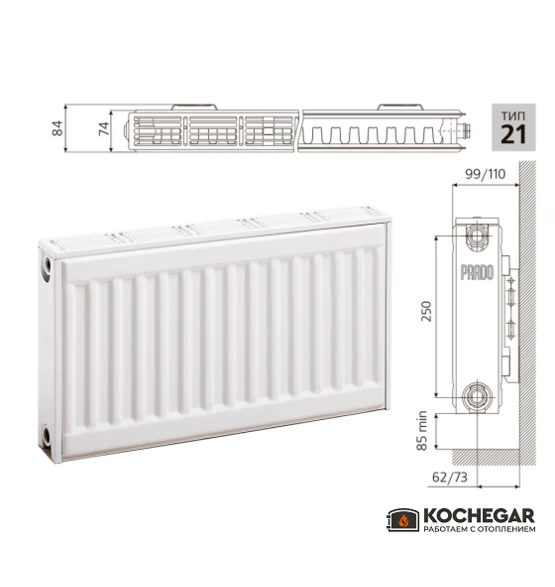 Cтальной панельный радиатор Prado Classic тип 21 c двумя рядами панелей по глубине, с однорядным оребрением, расположенным между панелями и приваренным к тыльной панели, с воздуховыпускной решеткой и боковыми стенками.