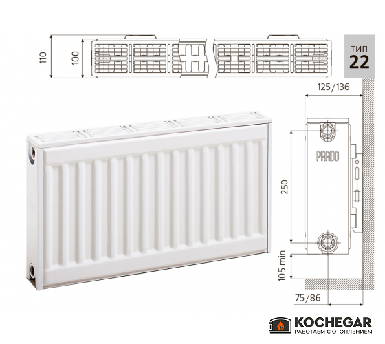 Cтальной панельный радиатор Prado Classic тип 22 с двумя рядами панелей по глубине с оребрением, расположенным между панелями и приваренным к каждой панели, с воздуховыпускной решеткой и боковыми стенками.