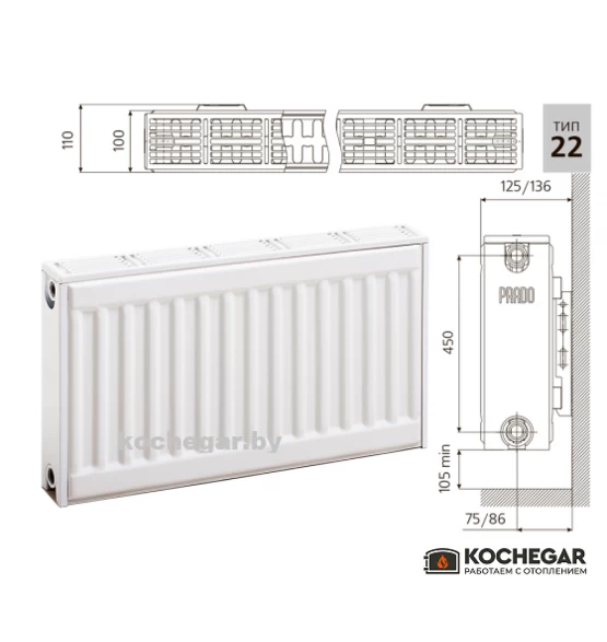 Cтальной панельный радиатор Prado Classic тип 22 c двумя рядами панелей по глубине с оребрением, расположенным между панелями и приваренным к каждой панели, с воздуховыпускной решеткой и боковыми стенками.