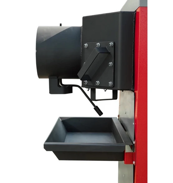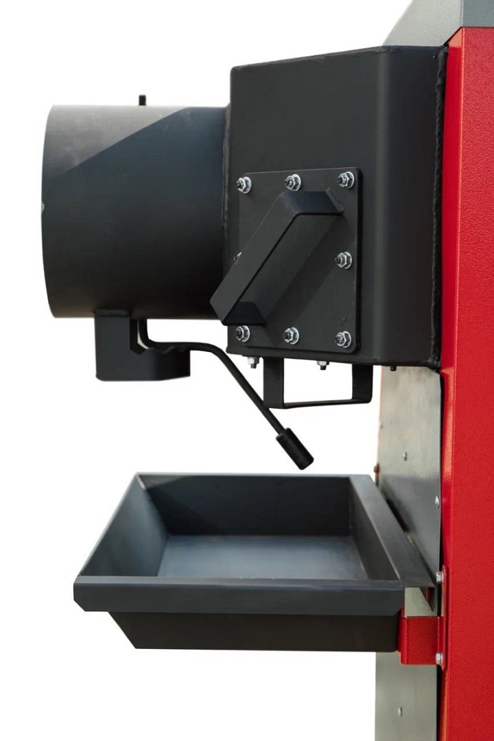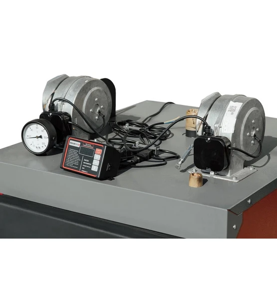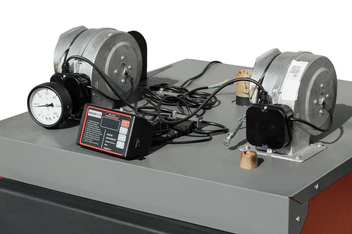 Модель оснащается автоматическим блоком управления и двумя вентиляторами для регулирования подачи воздуха, что помогает поддерживать заданный режим горения и повышать удобство эксплуатации. В комплекте предусмотрены аксессуары для обслуживания — кочерга-скребок, металлический ёрш и совок, а также руководство по эксплуатации и указатель температуры с паспортом.