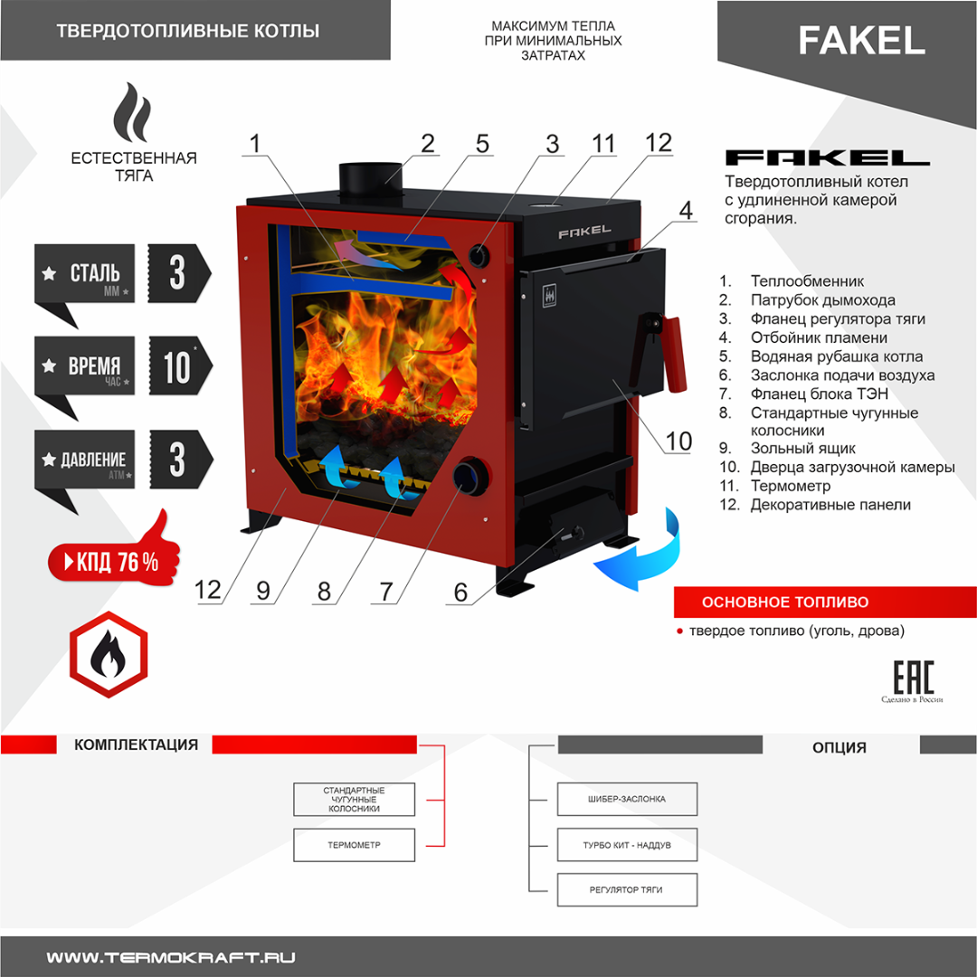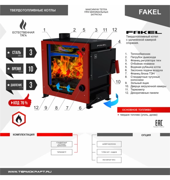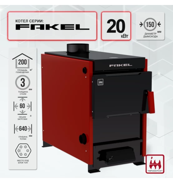 Стальной котел «FAKEL» предназначен для отопления жилых домов от 160 до 200 кв.м., оборудованных системами водяного отопления с естественной или принудительной циркуляцией. Относится к разряду бюджетных котлов, который способен справиться с отоплением малых площадей.