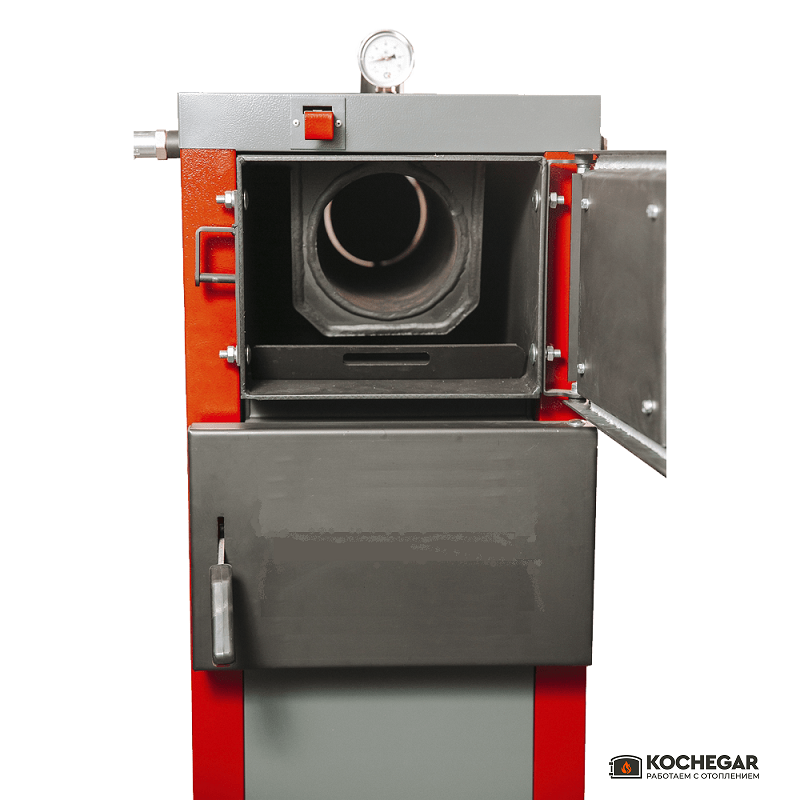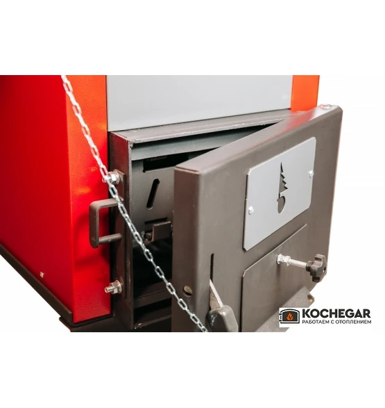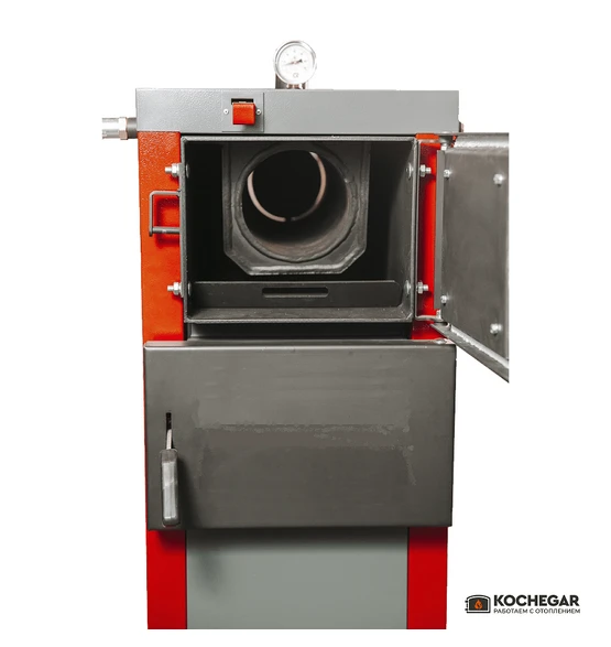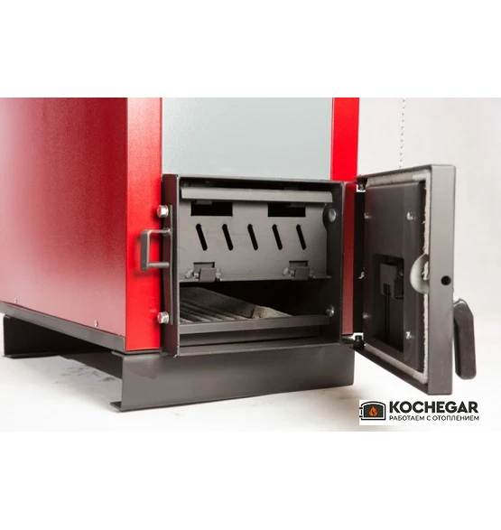 Котёл работает на дровах, брикетах и угле, обеспечивая универсальность в выборе топлива. Увеличенная топочная камера позволяет загружать крупные порции топлива, что снижает частоту обслуживания и продлевает время работы между загрузками.
